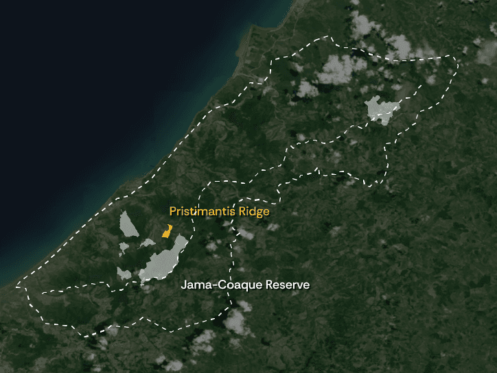 Pristimantis Ridge extends the Jama-Coaque Reserve to its northernmost point. Pristimantis is the name of a diverse genus of frogs commonly referred to as rain frogs or robber frogs, which can often be found during night hikes here (frog photos in the gallery are by TMA's resident herpetologist, Ryan Lynch). The property contains some of the most pristine remnants of moist forest and represents a key bulwark against the expansion of cattle pasture at the hands of the neighboring landowner.