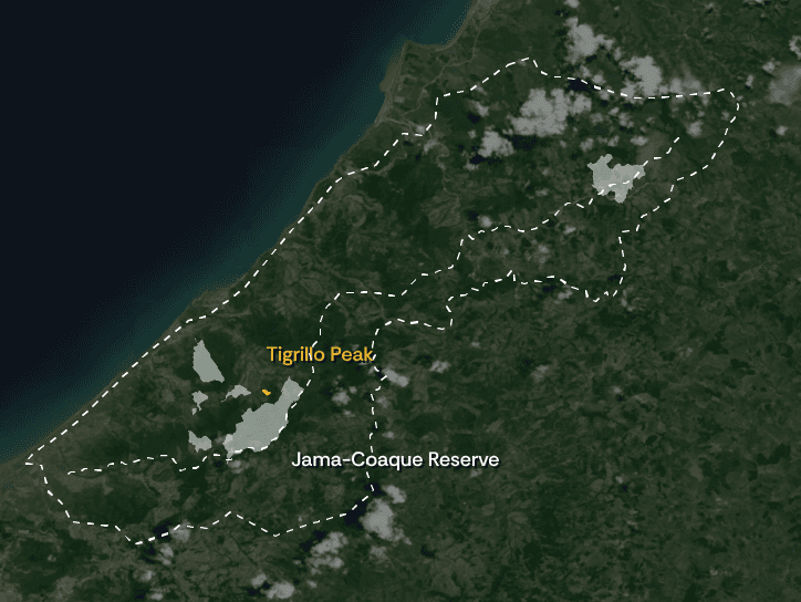 This property is a key puzzle pieces in the northward expansion of the Jama-Coaque Reserve. It marks the divide between two river basins. Due to the elevation (1,788 feet above sea level at its highest point), the vegetation sits at the interesting transition zone between Tropical Moist Evergreen Forest and Premontane Cloud Forest. It acquired its name because of numerous ocelot (tigrillo, in Spanish) sightings on the property.